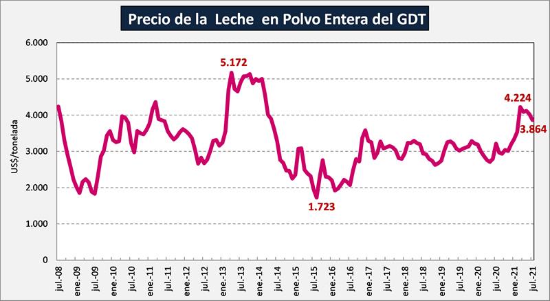 En el gráfico superior podemos observar la evolución promedio mensual de las cotizaciones del Global Dairy Trade (GDT) desde julio 2008 a julio 2021. En los primeros meses de éste año asistimos a una fuerte suba del precio de la leche en polvo entera (LPE) que llegó a US$ 4.224 luego comenzó sistemáticamente a disminuir el precio hasta los US$ 3.864 de la subasta de hoy. De todas maneras podemos ver en la serie que los precios actuales son los más altos desde finales de 2013 y principios de 2014.