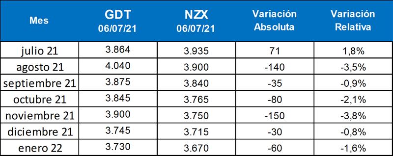 Los precios actuales y futuros del GDT pueden verse tanto en el cuadro superior como en el gráfico de abajo y están comparados con los precios que arroja del mercado de Futuros del NZX que a pesar que tiene mayor valor para la posición actual, luego es inferior en el resto de la serie hasta enero del 2021.