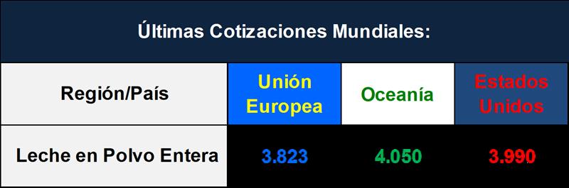 Una situación similar a ésta se da en América Latina, donde los precios de la LPE rondan los US$ 3.750 a US$ 3.850, lejos de los valores logrados por NZ que evidentemente están influenciados por las compras de China y por la proximidad comercial de Nueva Zelanda con todo el Sudeste de Asia.