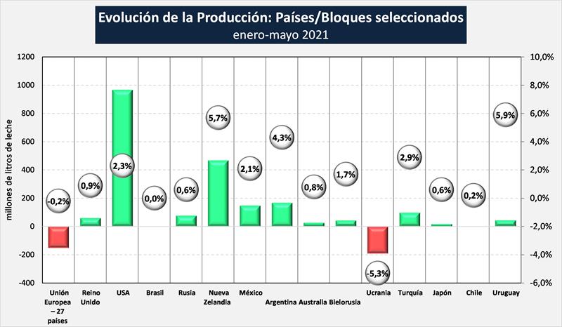 En el cuadro siguiente se toma un grupo seleccionado de los principales países productores e importadores que representan alrededor del 60% de la producción mundial de leche de vaca, en el cual se puede observar un aumento de la producción del 1,10%, para enero-mayo 2021 respecto igual período del año anterior.