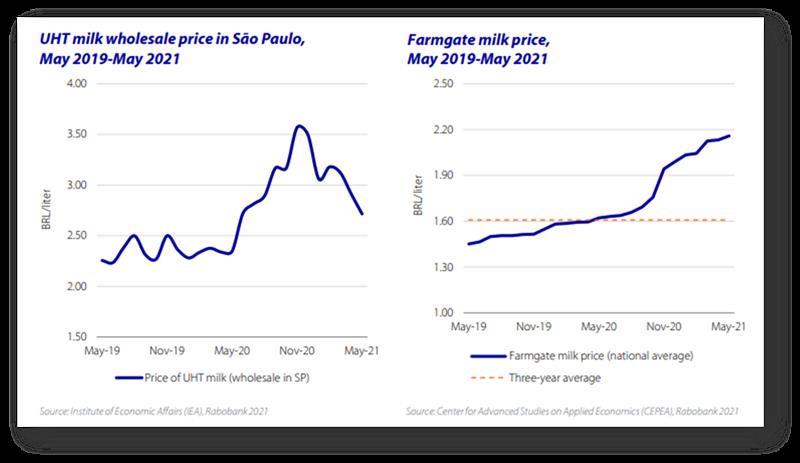 Según datos preliminares del Instituto Brasileño de Estadísticas (IBGE), la producción aumentó 1,8% en términos de volumen en comparación con el primer trimestre de 2020. Sin embargo, los costos han continuado aumentando en 2021, con la soja y el maíz manteniéndose en niveles elevados a pesar de un Real más fuerte. Según datos de CEPEA, los costos de producción de leche aumentaron 9,1% en los primeros cuatro meses del año, mucho más rápido que la inflación anual, y ayudaron a reducir los márgenes para los productores.