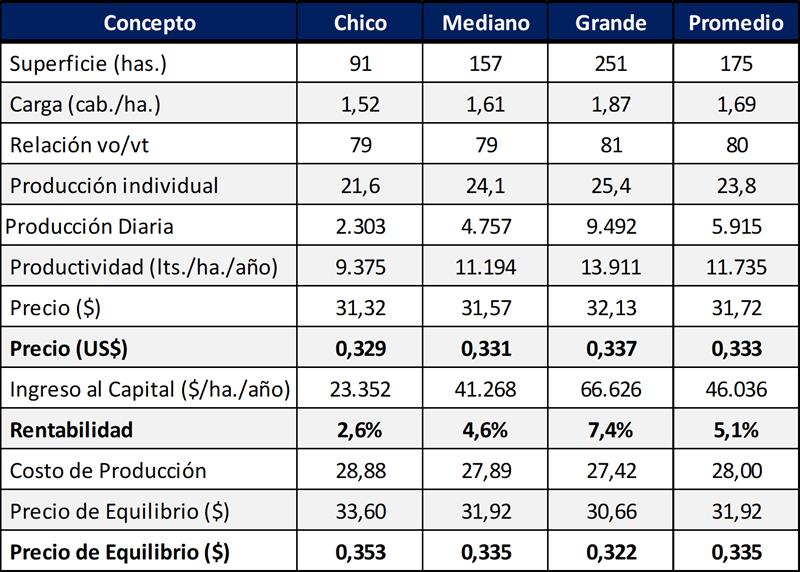 Cuando se analiza cada región y cada estrato pueden observarse diferentes realidades referidas a los niveles de productividad y eficiencia, y aunque tamaño no es sinónimo de eficiencia, los tambos de los estratos más grandes son los que generalmente presentan menores costos, mejores precios y mayores tasas de rentabilidad.