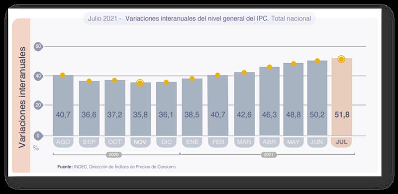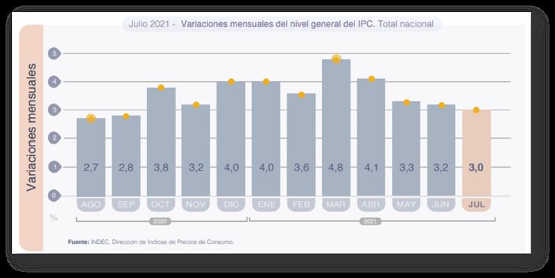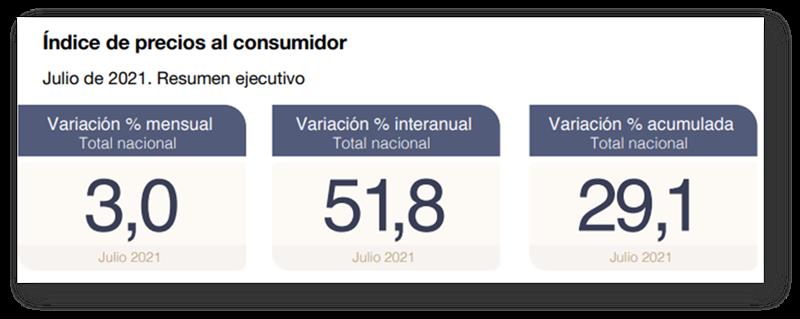 El nivel general del Índice de precios al consumidor (IPC) representativo del total de hogares del país registró en julio una variación de 3,0% con relación al mes anterior, del 29,1% en el período enero-julio 2021 y del 51,8% en el interanual.
