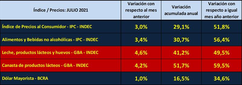 Precios de los lácteos al mes de julio del 2021 13/8/2021