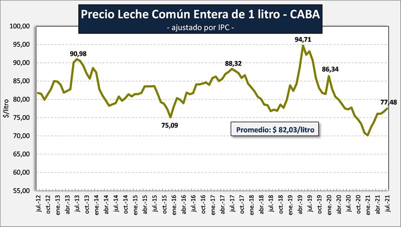 Según datos publicados por la Dirección General de Estadísticas y Censos - Ministerio de Hacienda del Gobierno de la Ciudad de Buenos Aires, los precios de los productos lácteos de esta canasta, tuvieron un crecimiento mensual promedio ponderado del 4,9% e interanual del 54,8%. El ponderado es elaborado por OCLA sobre el mismo criterio mencionado para la canasta GBA de INDEC.