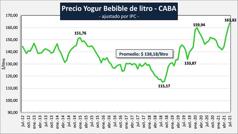 La situación de los yogures bebibles de litro es diferente, sostienen el nivel de consumo de la categoría, sus precios se ajustaron durante 2020 con el ritmo inflacionario, pero lamentablemente tiran para abajo el promedio del mix, ya que su aumento de ventas no fue acompañado por las ventas de yogures en pote, postres y flanes que tienen un mayor valor por litro equivalente.