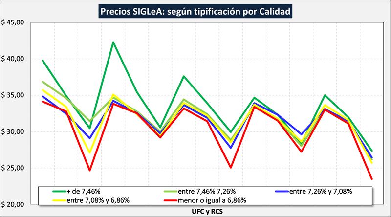 En el cuadro de tipificación, la leche comercializada se divide en 25 estratos según composición y calidad higiénico-sanitaria y, dentro de cada estrato, se muestra un promedio ponderado del precio del total de esos litros y además un promedio ponderado del 20% superior e inferior de los precios.