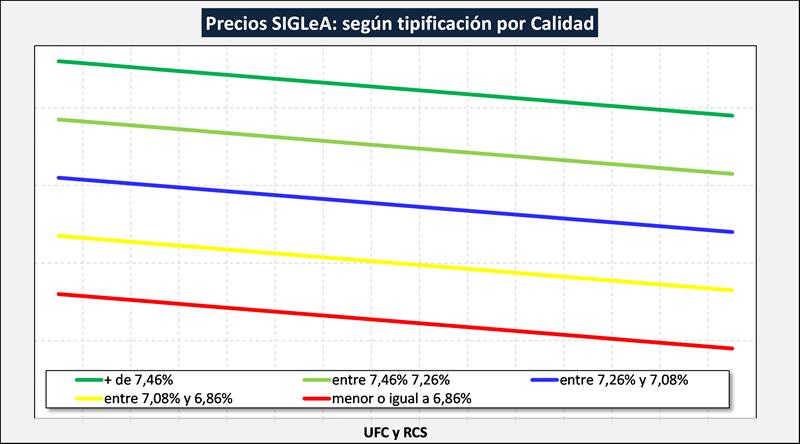 En el gráfico de arriba se presentan en 5 curvas por Tipo de leche en función a los sólidos útiles (grasa butirosa + proteína), los diferentes precios en función a la calidad higiénico-sanitaria (UFC/ml y RCS/ml). Se puede observar que existen precios descendentes en cada tipo composicional a medida que desmejora la calidad higiénico-sanitaria, pero se dan serruchos ya que las “penalizaciones” por menor calidad se ven compensados seguramente por la presencia de bonificaciones comerciales que pueden estar especificadas y tabuladas (ejemplo: volumen, temperatura, distancia, permanencia, etc.) o arbitrarias en función a aspectos no especificados en los Sistemas de Tipificación y Pago de la Leche (netamente comerciales).