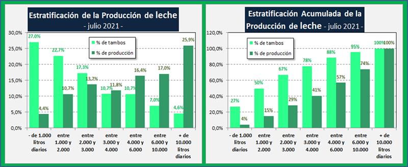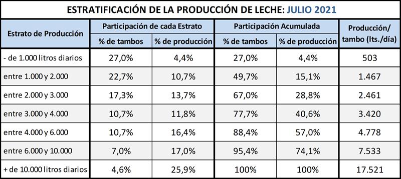 Puede observarse que los aproximadamente 460 tambos del estrato de + de 10.000 litros de producción diaria, que produjeron durante el mes de julio un promedio de 17.521 litros diarios, representan el 4,6% del total de tambos y aportan el 25,9% de la producción total. Esto es el setenta por ciento más leche, que la que aportan los 5.000 tambos de menos de 2.000 litros diarios y que son el 49,7% de los tambos totales, que representan el 15,1% de la producción nacional.