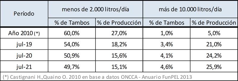 Puede verse en los meses de julio de los últimos tres años (2019-2021), y también comparado con datos disponibles del año 2010, que en un extremo disminuye la participación tanto en cantidad de tambos como en el volumen de producción de las unidades productivas de menos de 2.000 litros diarios y en el otro extremo de la estratificación, se incrementa la participación de las unidades de más de 10.000 litros diarios.