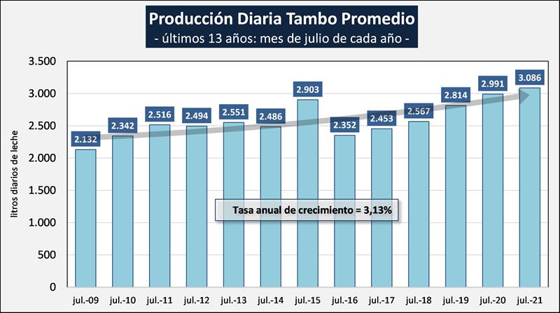 Sobre la base de la producción mensual y la cantidad anual de tambos (SENASA), podemos inferir el tamaño del tambo promedio, unos 3.086 litros de leche diarios para julio del 2021, un 3,2% más que el año anterior. Si evaluamos su comportamiento en el tiempo, a pesar de la disminución en el número de unidades productivas y en el número de vacas, el tambo promedio presenta en el período 2009-2021 una tasa de crecimiento acumulada anual del 3,13% lo que permite, a pesar de la reducción en las unidades productivas y en el rodeo, el sostenimiento de los niveles productivos agregados a nivel país.