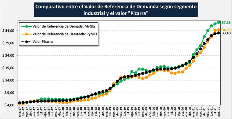 Se observa en el gráfico una mayor capacidad de pago en el mes de agosto/21 del segmento de MyGEs que del segmento PyMEs, $ 37,35 y $ 34,33, respectivamente. La capacidad de pago de las MyGES estuvo $ 4,25 por encima del precio real pagado y el de las PyMEs $ 1,23.