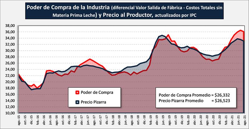 Viendo el precio pizarra liquidado y comparado con la capacidad de pago promedio de la industria, actualizada por IPC, para un período más prolongado, puede observarse que en el largo plazo (salvo oscilaciones temporales) los valores promedio convergen: $ 26,52 por litro de Precio Pizarra y $ 26,33 por litro de Poder de Compra.