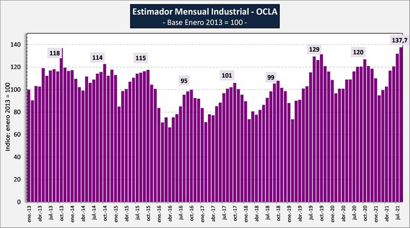 El EMI-OCLA asciende a 137,7 en agosto del 2021, valor 4,4% superior al mes anterior y +14,4% respecto a igual mes del año anterior, el volumen de producción interanual fue superior en un 3,9%, lo cual indica una mejora de precios en moneda constante. Desde que se analiza este indicador (104 meses), el promedio de los 8 meses de julio anteriores llega al valor índice 111,4 vs 137,7 actual (+23,6% el actual) y no hay ningún mes de julio en la serie que supere al actual.
