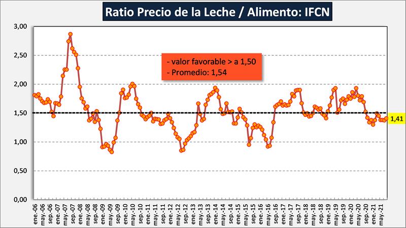 Relación leche/alimento: Se define como el precio de la leche dividido por el precio de los alimentos adquiridos. Son los Kilogramos de concentrados que un agricultor puede comprar después de vender un litro de leche. El Índice de precios de alimentación > a 1,5 se considera favorable.