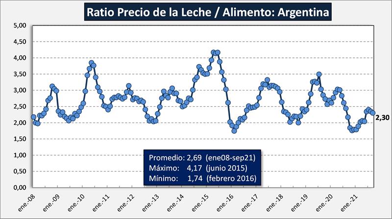 Se calcula como el cociente entre el precio de la leche al productor del Panel de 18 Empresas de la DNL-MAGyP y un vector de gastos que incluye alimentación suplementaria (concentrados y silaje) y el costo de oportunidad de la tierra, ya sea propia y/o alquilada. La inclusión de este último componente, que no existe en el modelo estadounidense, se realizó por dos razones. En primer lugar, en Argentina no está disponible un precio representativo de pasturas, alimento importante en la dieta del rodeo lechero. En segundo lugar, alrededor del 50% de la superficie tambera es alquilada, gasto que aplica al corto plazo en la economía de las empresas tamberas.