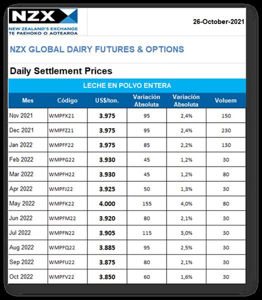 Precio de la Leche en Polvo Entera en el Mercado de Futuros 26/10/2021