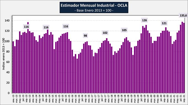 El EMI-OCLA asciende a 135,6 en septiembre del 2021, valor 1,5% inferior al mes anterior (+1,8% en el promedio diario) y +12,5% respecto a igual mes del año anterior, el volumen de producción interanual fue superior en un 4,0%, lo cual indica una mejora de precios en moneda constante. Desde que se analiza este indicador (105 meses), el promedio de los 8 meses de septiembre anteriores llega al valor índice 112,5 vs 135,6 actual (+20,5% el actual) y no hay ningún mes de septiembre en la serie que supere al actual.