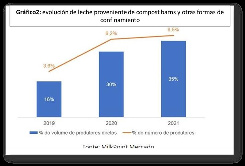 Un primer dato interesante es el volumen de leche de los sistemas confinados, principalmente en los establos de compostaje. Desde hace algunos años, nuestro equipo de MilkPoint Mercado ha estado realizando un relevamiento, y el gráfico 2 muestra el crecimiento de la leche de este sistema y otros en confinamiento.