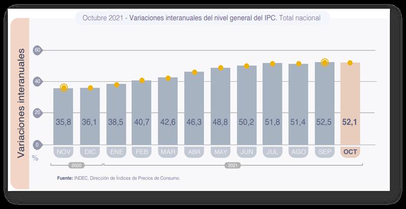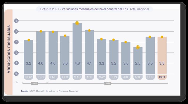 El nivel general del Índice de precios al consumidor (IPC) representativo del total de hogares del país registró en octubre una variación de 3,5% con relación al mes anterior, del 41,8% en el período enero-octubre 2021 y del 52,1% en el interanual.