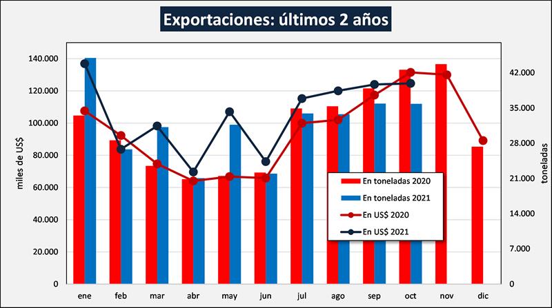 Otro dato a resaltar y que a veces confunde para el análisis, es el referido a las cotización que se dan en el momento de acordar la operación de exportación y el valor que se refleja en las estadísticas para un mes determinado. Hay diferencias en el valor de las operación que se están acordando en ese mes y el valor que se publica para ese mes, lo cual se debe a que las operaciones que se registran en las estadísticas de un mes determinado, fueron con precios pactados dos o tres meses antes de la efectivización de la operación y por ende de su registro en las estadísticas. Seguramente los valores pactados en octubre se reflejen en las estadísticas de diciembre 2021 y/o enero 2022.