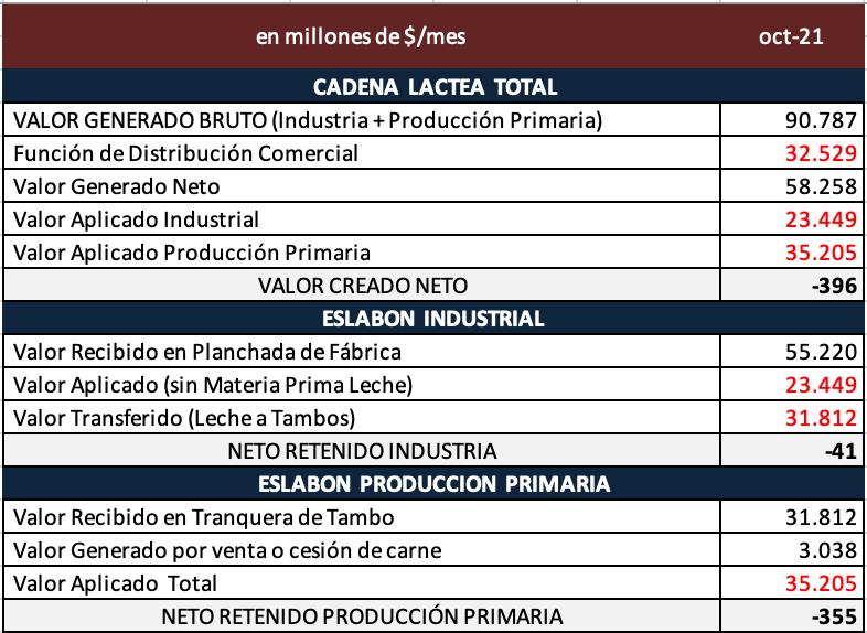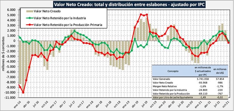 En el gráfico de arriba se puede ver la evolución del valor creado general y por los dos principales eslabones de la cadena, actualizados por el índice de precios al consumidor. Además se presenta un cuadro resumen donde se ven los resultados acumulados desde diciembre 2015 a octubre 2021 tanto en pesos constantes como en dólares y es de remarcar que al sector le faltó durante todo éste período unos US$ 0,016 por litro de leche para estar en equilibrio, es decir, pagar todos sus costos en efectivo directos e indirectos, mantener el capital y lograr un costo de oportunidad del mismo.