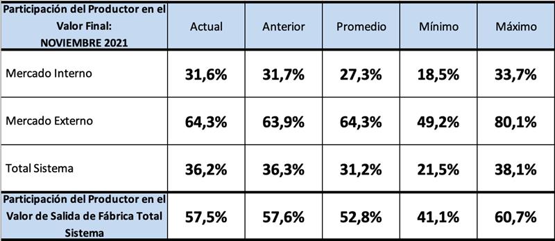La participación del productor en el total del sistema fue para noviembre del 2021 del 36,2%, 0,1 puntos por debajo del mes anterior, bastante por encima de la media del 31,2%. Se produjo una baja en la participación en los valores finales de mercado interno (0,1 puntos porcentuales) y una suba de 0,4 puntos porcentuales en la participación de los valores de mercado externo, siendo esta última igual a la media histórica de la serie disponible (64,3%). La participación del productor sobre el valor de salida de fábrica (precio al que vende la industria) fue de 57,5%, 0,1 puntos por debajo del mes pasado y 4,7 puntos encima del promedio de la serie (52,8%). Cabe recordar que la serie histórica para los valores de salida de fábrica tiene una mayor extensión temporal que el resto.