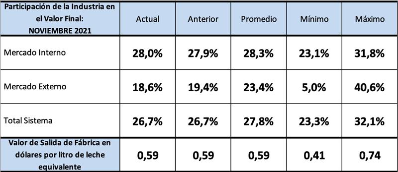La industria mejora mínimamente en noviembre del 2021 su performance de participación en el mercado interno (0,1 puntos), aunque en el mercado externo baja su importancia relativa (0,8 puntos), manteniendo su participación en el total del sistema (26,7%). La facturación total de salida de fábrica por litro de leche equivalente estuvo en US$ 0,59, igual que el mes anterior y el promedio de la serie disponible y 15 centavos menos que el máximo logrado en mayo y octubre de 2013. Estos niveles de facturación en ambos mercados como en el total, están muy lejos de los valores que se logran en los principales países lecheros que se ubican en un valor cercano al dólar por litro equivalente (en planchada de fábrica) y que no se dan en Argentina por las interferencias entre el mercado y los actores de la cadena que mencionamos más arriba.