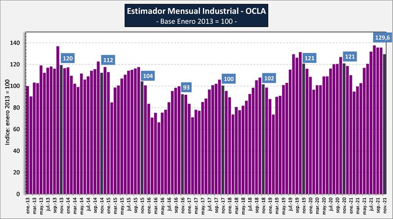El EMI-OCLA asciende a 129,6 en noviembre del 2021, valor 4,5% inferior al mes anterior (-1,3% en el promedio diario) y +7,1% respecto a igual mes del año anterior, el volumen de producción interanual fue superior en un 4,5%, lo cual indica una mejora de precios en moneda constante. Desde que se analiza este indicador (107 meses), el promedio de los 8 meses de noviembre anteriores llega al valor índice 109,1 vs 129,6 actual (+18,8% el actual) y noviembre del 2021 es el valor más alto alcanzado en los meses de noviembre de los últimos 9 años. Esto responde a que la cadena genera mas valor por vía de la mayor producción como un valor unitario superior, lo que no indica que sus dos principales eslabones capturen en su totalidad esa mejora, debido a las interferencias tanto de mercado interno como de mercado externo.