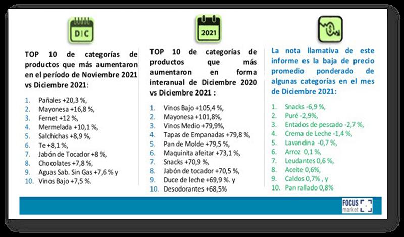 Focus Market (vía lector de código de barra) selecciona un conjunto de 70 skus (Stock Keeping Unit - unidad de stock de mantenimiento) que engloba a 682 productos de diferentes marcas y presentaciones a los efectos de evaluar la evolución de precios de Diciembre 2020 vs Diciembre 2021 y analizar la variación porcentual de precios del mismo período y la variación porcentual de precios del mes de Noviembre 2021 respecto Diciembre 2021 en las categorías seleccionadas.
