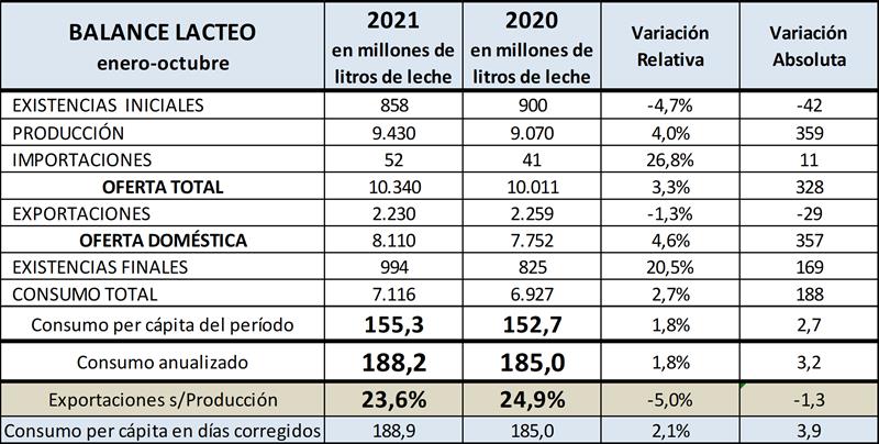 Balance Lácteo: ene-oct 2021 11/1/2022