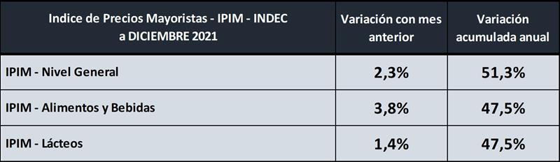 Índice de Precios Internos Mayoristas – IPIM – Lácteos – diciembre 2021 18/1/2022
