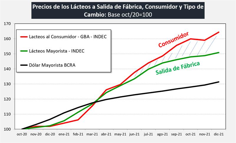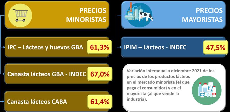 El índice mayorista de precios de los Lácteos registró un aumento de 1,4% en diciembre de 2021 respecto del mes anterior, y acumula una suba del 47,5% en los últimos 12 meses.