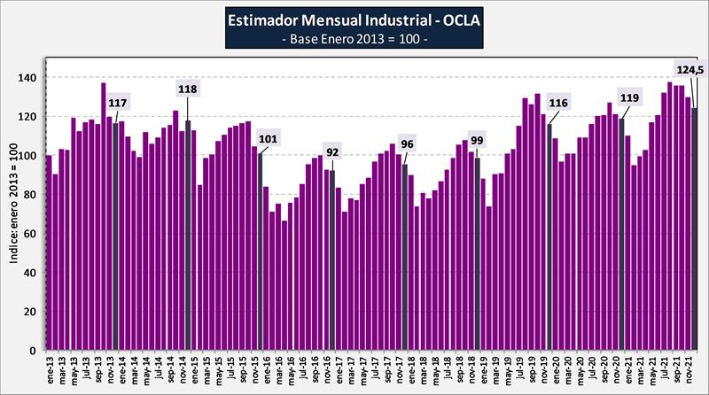 El EMI-OCLA asciende a 124,5 en diciembre del 2021, valor 3,9% inferior al mes anterior (-7,0% en el promedio diario) y +4,9% respecto a igual mes del año anterior.