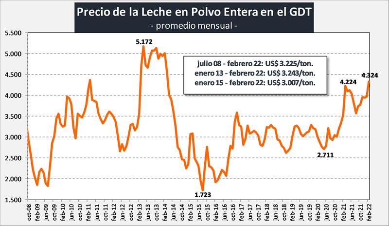 En la primera subasta de febrero 2022 el precio de la LPE llega a los US$ 4.324/ton., lo que implica “el valor más alto mensual desde marzo del 2014” (ya que el valor del 02/03/21 fue de US$ 4.364/ton.), cuando asistimos al período de altísimos precios de 2013 y 2014.