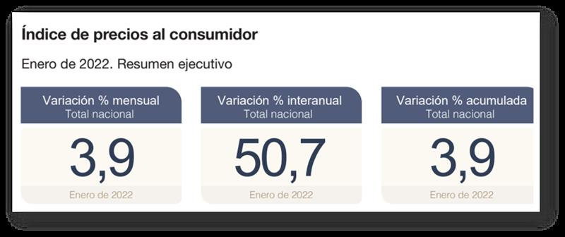 El nivel general del Índice de precios al consumidor (IPC) representativo del total de hogares del país registró en enero una variación de 3,9% con relación al mes anterior, y del 50,9% en el interanual.
