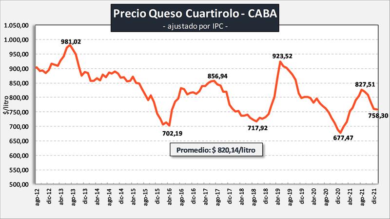 En el caso del queso cuartirolo, tiene una situación bastante similar a la planteada en el caso de la leche fluida. Estuvo en descenso prácticamente dos años, con recupero en los primeros ocho meses del 2021, pero en enero 2022 está -7,5% que el promedio y 17,9% por debajo del máximo de mediados del 2019 y 22,7% por debajo del máximo de esta serie a mediados del 2013, lo cual marca claramente una tendencia descendente en el precio en esta serie histórica de 10 años.