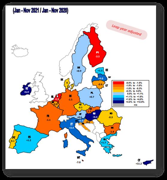 Reducciones importantes se han registrado en Holanda (-2,6%), Alemania (-1,8%), Francia (-1,5% dato de todo el año 2021) y Dinamarca (-0,3%). Sin embargo, se han constatado importantes incrementos en Irlanda (+5,9%), Italia (+3,1%) y Polonia (+0,4%).