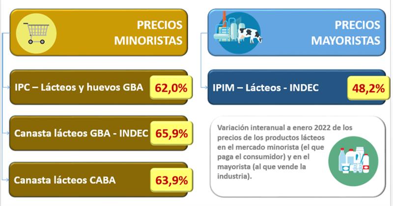 El índice mayorista de precios de los Lácteos registró un aumento de 3,7% en enero de 2022 respecto del mes anterior, y acumula una suba del 48,2% en los últimos 12 meses.