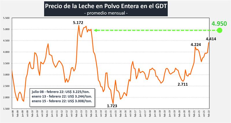 De concretarse estos precios en el mercado disponible del GDT, el precio futuro de mayo 2022 sería el precio mensual más altos de los últimos 99 meses (US$ 5.002 feb/2014).