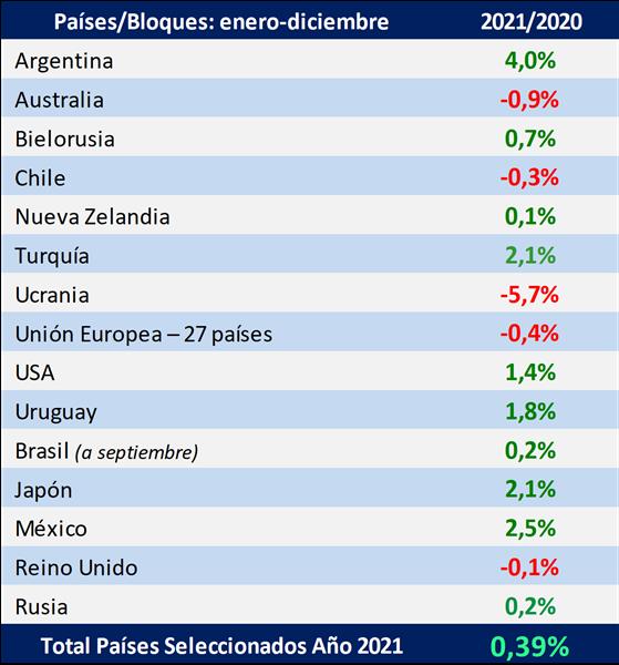 En el cuadro siguiente se toma un grupo seleccionado de los principales países productores e importadores que representan alrededor del 60% de la producción mundial de leche de vaca, en el cual se puede observar un aumento de la producción del 0,39%, para el año 2021 respecto a igual período del año anterior.