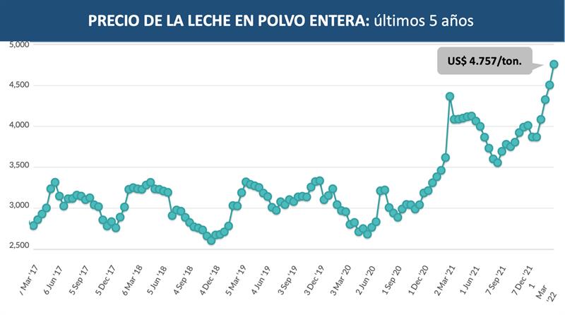 Por cuarta vez consecutiva, los precios de todos los productos de la subasta han aumentado. Es importante señalar que tanto el precio promedio como el de la leche en polvo entera están en los valores máximos (5.065 y 4757 U$S/tn), no observados desde febrero 2014.