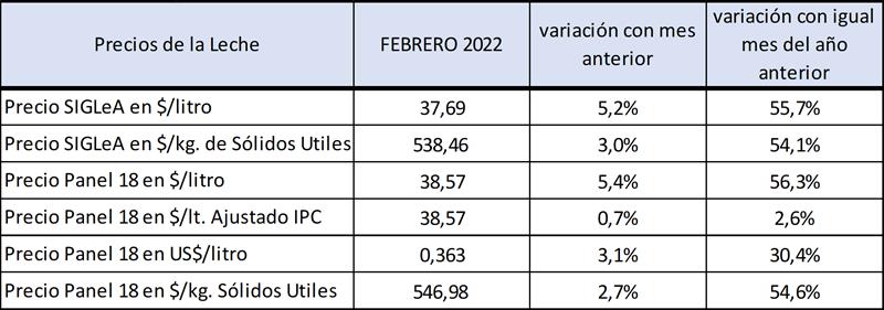 Precios de la leche al productor – febrero de 2022 15/3/2022