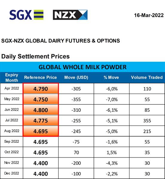 Mercado de Futuros NZX – Leche en Polvo Entera 16/3/2022