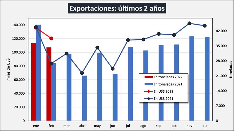 La variación intermensual de las exportaciones fue de -5,5% en volumen y de -11,5% en valor (feb/22 vs. ene/22). La variación interanual fue de +27,2% en volumen y +43,8% en valor (feb/22 vs. feb/21).