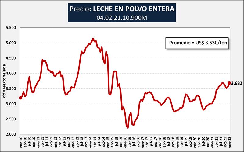 El precio medio de exportación por tonelada fue de US$ 3.626 para él bimestre, lo que implica un incremento del 18,2% respecto al primer bimestre de 2021. En el caso particular del rubro Leche en Polvo, el precio promedio fue de US$ 3.495/ton. un 15,9% por encima del igual período del año anterior.