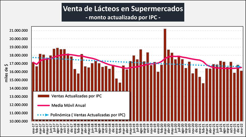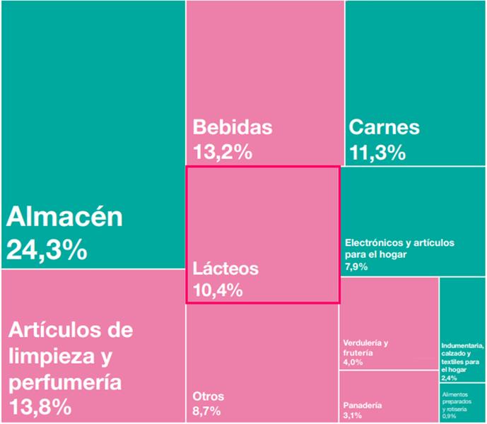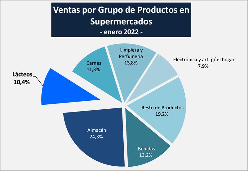 La participación de los lácteos en las ventas totales de los supermercados fue del 10,4% (10,4% en enero de 2021 y 10,9% en enero de 2020).