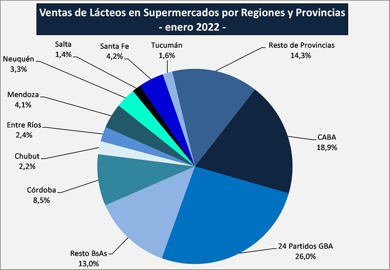 Las ventas de lácteos en super se concentra en Buenos Aires (CABA + GBA + Resto Provincia) con una participación del 57,9%.
