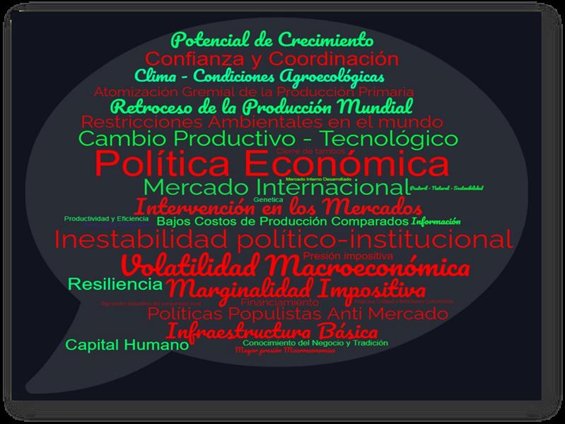 Hemos mencionado a la política en las debilidades y aquí en las amenazas el comentario de los encuestados se hace más fuerte respecto a este punto. La Intervención de los mercados, la Inestabilidad Político-Institucional recurrente, la altísima Volatilidad de las variables económicas locales, lo cual viene acompañado de una fuerte Inseguridad Jurídica que impide un adecuado Clima de Negocios, aleja la inversión y expulsa a muchos de los actores sectoriales.