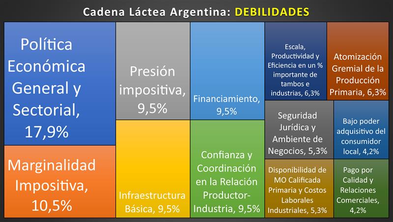 De los cuatro tópicos del FODA, lamentablemente las debilidades son las que presentan un gran número y diversidad. Independientemente de las cuestiones ideológicas o partidarias se presenta a la Política en general y a la económica y sectorial en particular, como un gran inconveniente para el normal desempeño de la cadena de valor lácteo.